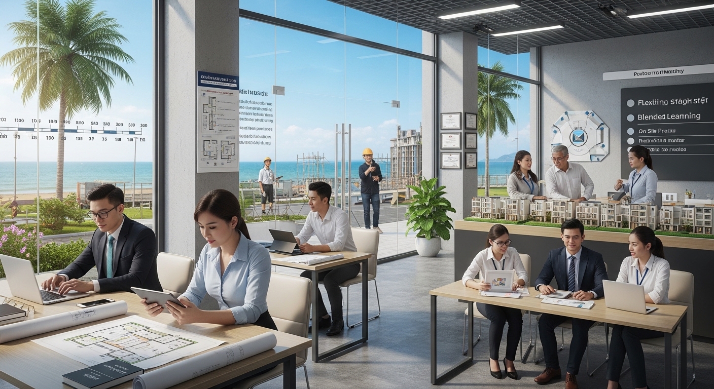 Kết hợp học Online và Offline: Nhiều chương trình đào tạo cho phép học lý thuyết trực tuyến (Online) và chỉ yêu cầu đến lớp trong các buổi thực hành hoặc ôn thi. Điều này cực kỳ phù hợp với đặc thù di chuyển liên tục của nghề BĐS tại một tỉnh rộng như Bình Thuận.