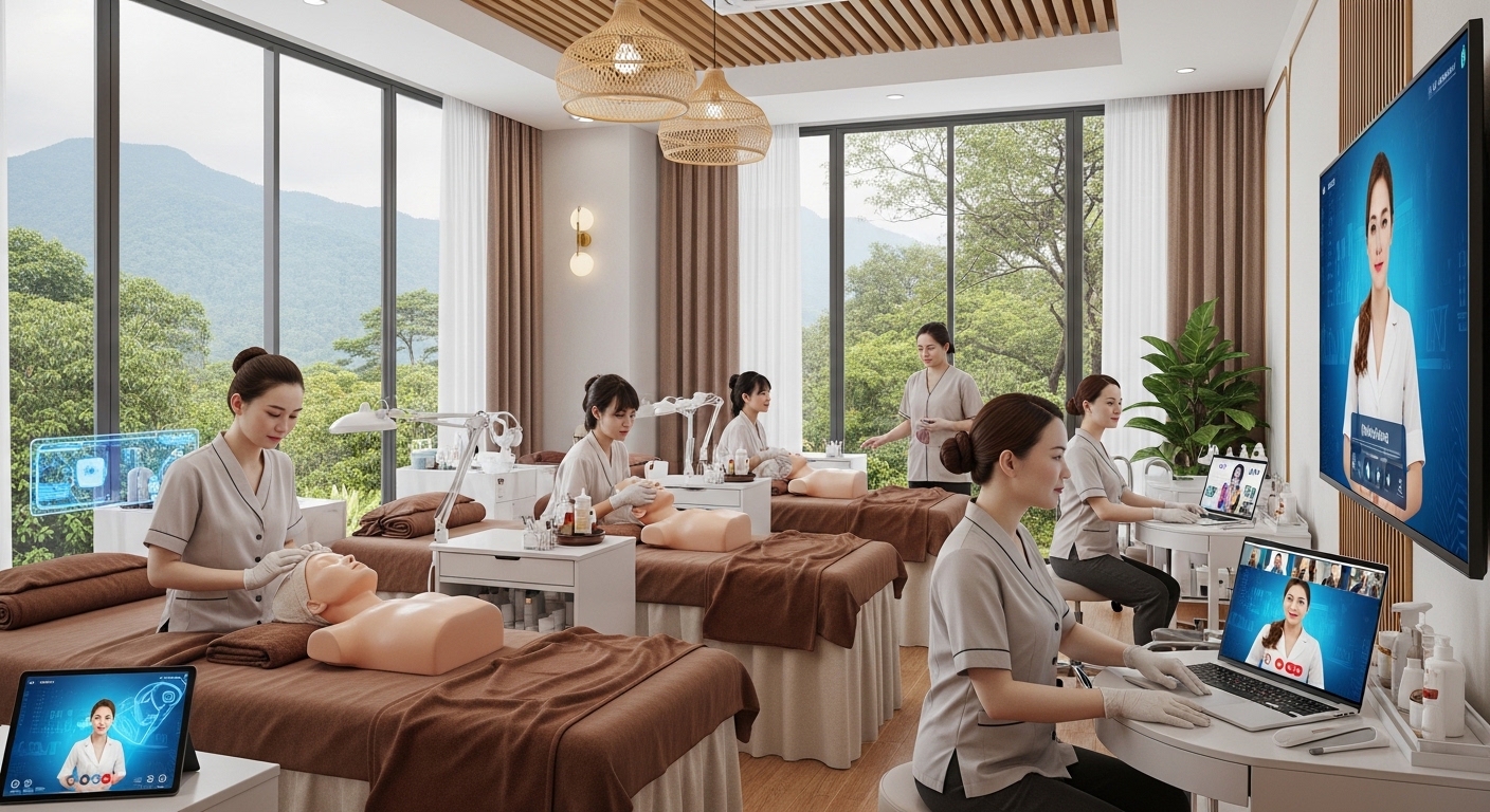 Trước đây, việc học nghề thẩm mỹ đòi hỏi học viên phải có mặt 100% tại cơ sở đào tạo. Tuy nhiên, với sự tiến bộ của công nghệ giáo dục, mô hình học từ xa (E-learning) kết hợp thực hành tập trung đang trở thành một xu hướng mang tính cách mạng, đặc biệt phù hợp với đặc thù địa lý rộng lớn tại Kon Tum.
