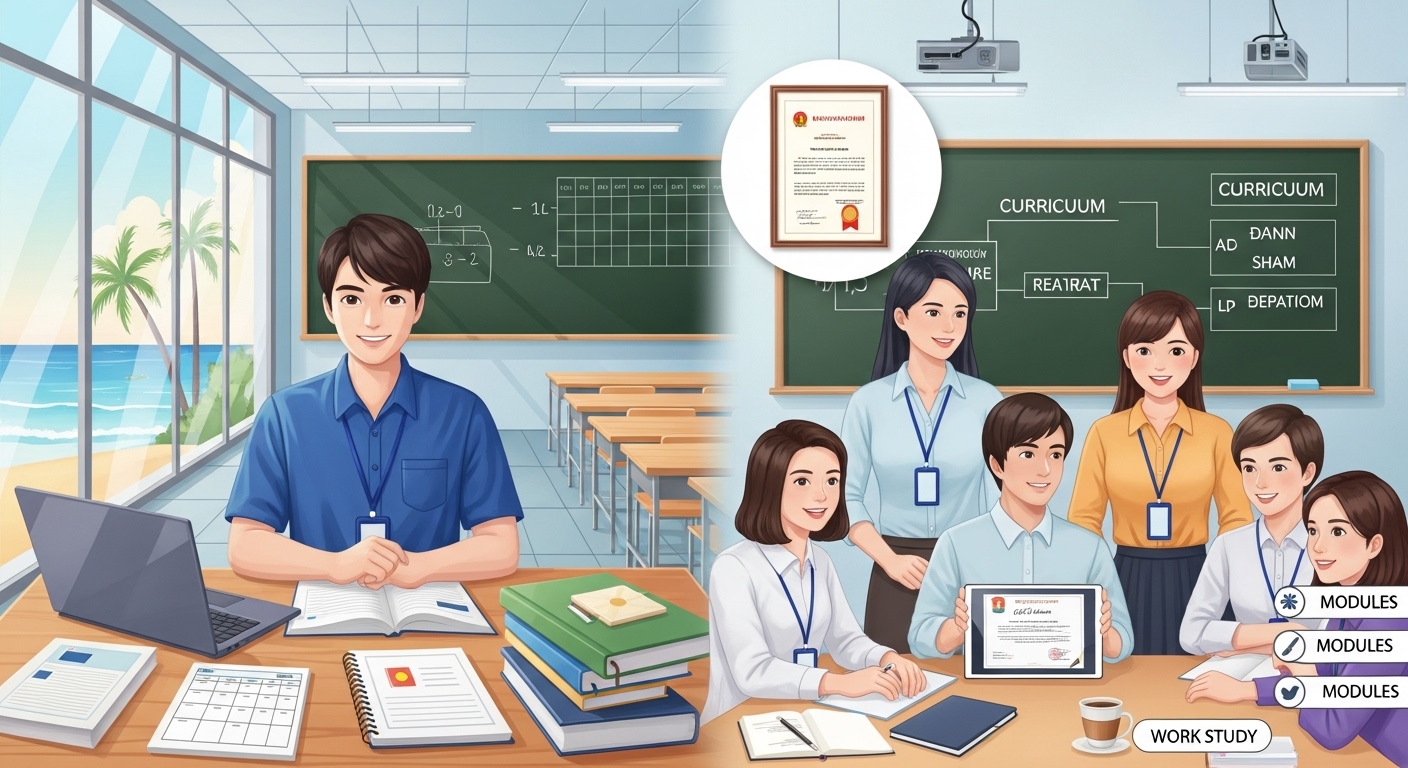Đặc điểm: Thời gian học nhanh, chú trọng vào kỹ năng đứng lớp cơ bản và truyền đạt nghề nghiệp thực tế.