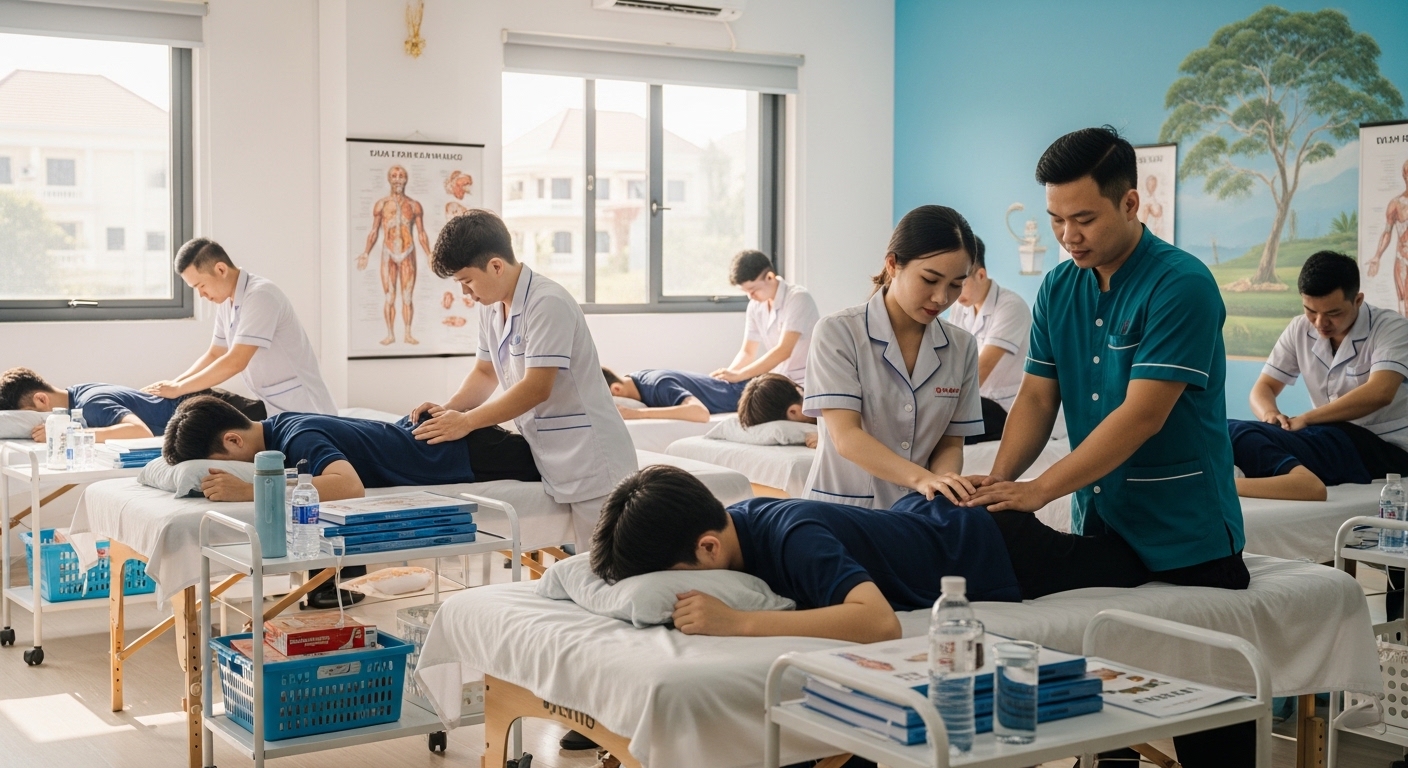 - Module 2 (Thực hành – 60-80 giờ): 30+ kỹ thuật xoa bóp, bấm 108 huyệt đạo chính, kết hợp tinh dầu, dụng cụ hỗ trợ.