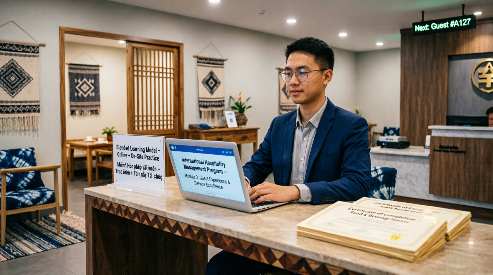 Các chương trình liên kết giúp học viên Kon Tum sở hữu chứng chỉ song ngữ, tập trung vào Phục vụ phòng (Buồng) và Lễ tân khách sạn. Học phí cạnh tranh, hỗ trợ từ xa 100%, giúp bạn tiết kiệm chi phí di chuyển mà vẫn đạt chuẩn nghề nghiệp.