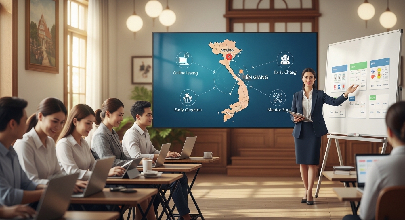 Đây là đơn vị tiên phong với mô hình “Đào tạo kết hợp Online và Offline” (Blended Learning), được giới thiệu là lựa chọn hàng đầu cho người đi làm và có con nhỏ tại Tiền Giang .