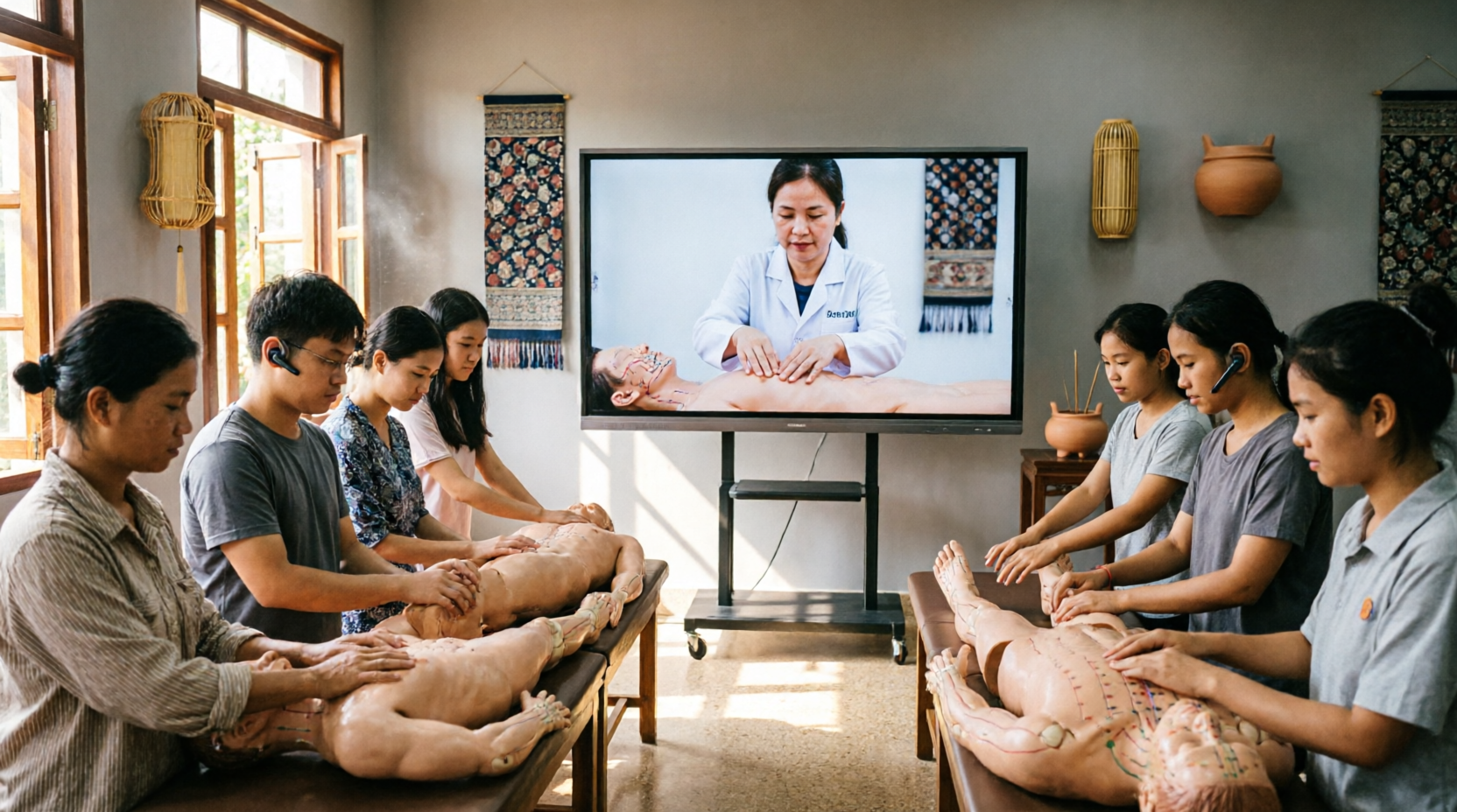 Thứ nhất, về phương pháp học: Học từ xa không có nghĩa là bạn chỉ “nhìn màn hình rồi thôi”. Chương trình được thiết kế theo dạng Module thông minh. Phần lý thuyết (Hệ thống kinh lạc, huyệt đạo, giải phẫu sinh lý cơ bản, chống chỉ định trong xoa bóp) được giảng dạy trực tuyến qua Zoom/Google Meet hoặc video quay sẵn. Phần thực hành, học viên sẽ được xem các video thao tác cận cảnh (cầm tay chỉ việc qua góc máy quay chi tiết), sau đó tự thực hành và quay video gửi lại cho giảng viên chấm điểm. Tại một số thời điểm, sẽ có các buổi thực hành tích lũy ngắn ngày để chuẩn hóa tay nghề.